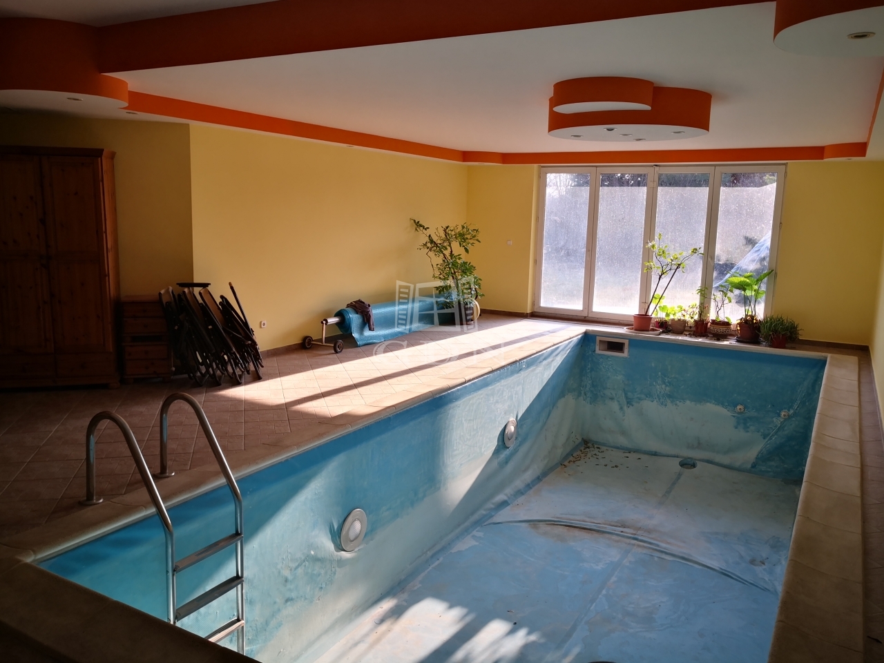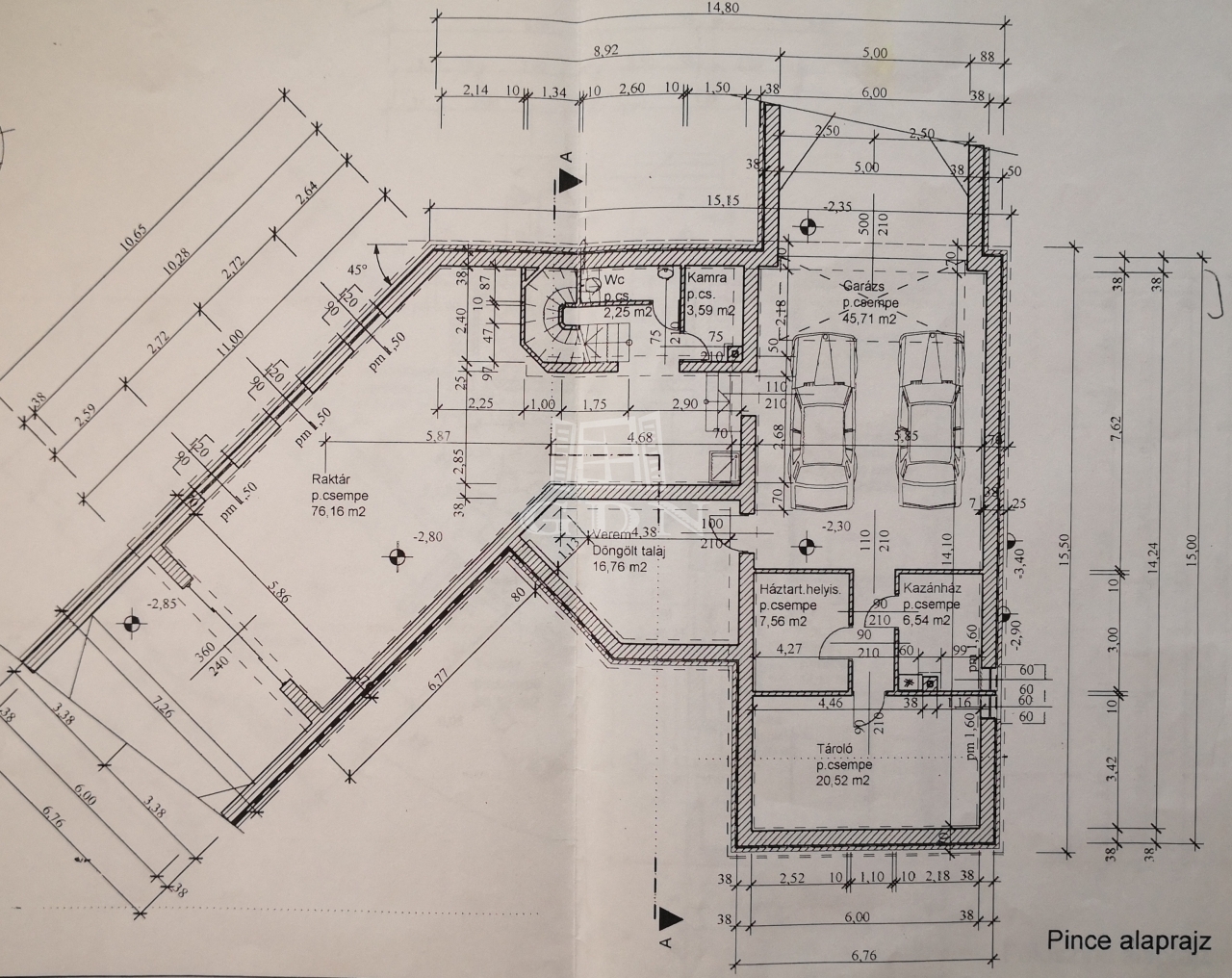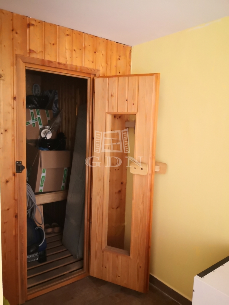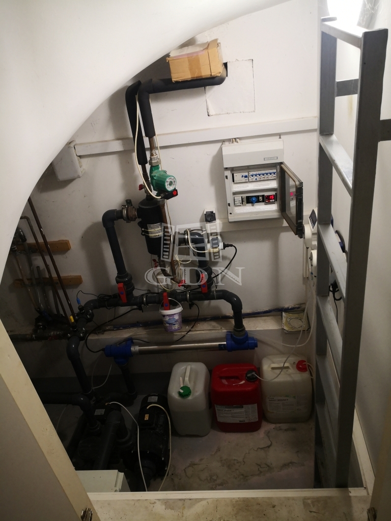 A pinceszinten kapott helyet a kétállásos garázs, a kazánház, a tárolók és a kamra. Innen nyílik az ellenáramoltatóval ellátott, fedett uszoda, a szauna és a borospince is. A ház fűtését és a meleg vizet hőszivattyú biztosítja, de alternatív lehetőségként van vegyes tüzelésű kazán, gáz-cirkó rendszer radiátorral és a nappaliban kandalló, ami nem csak hangulatossá teszi ezt a szintet, de képes az egész ház fűtésére is. Ezen kívül 36 db napelem biztosítja az áramellátást, amely a 200 nm-es műhely tetején helyezkedik el.