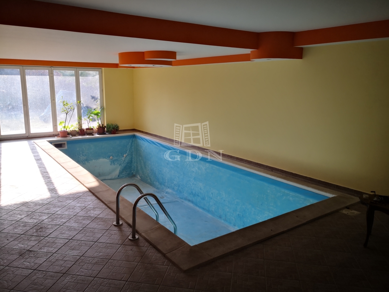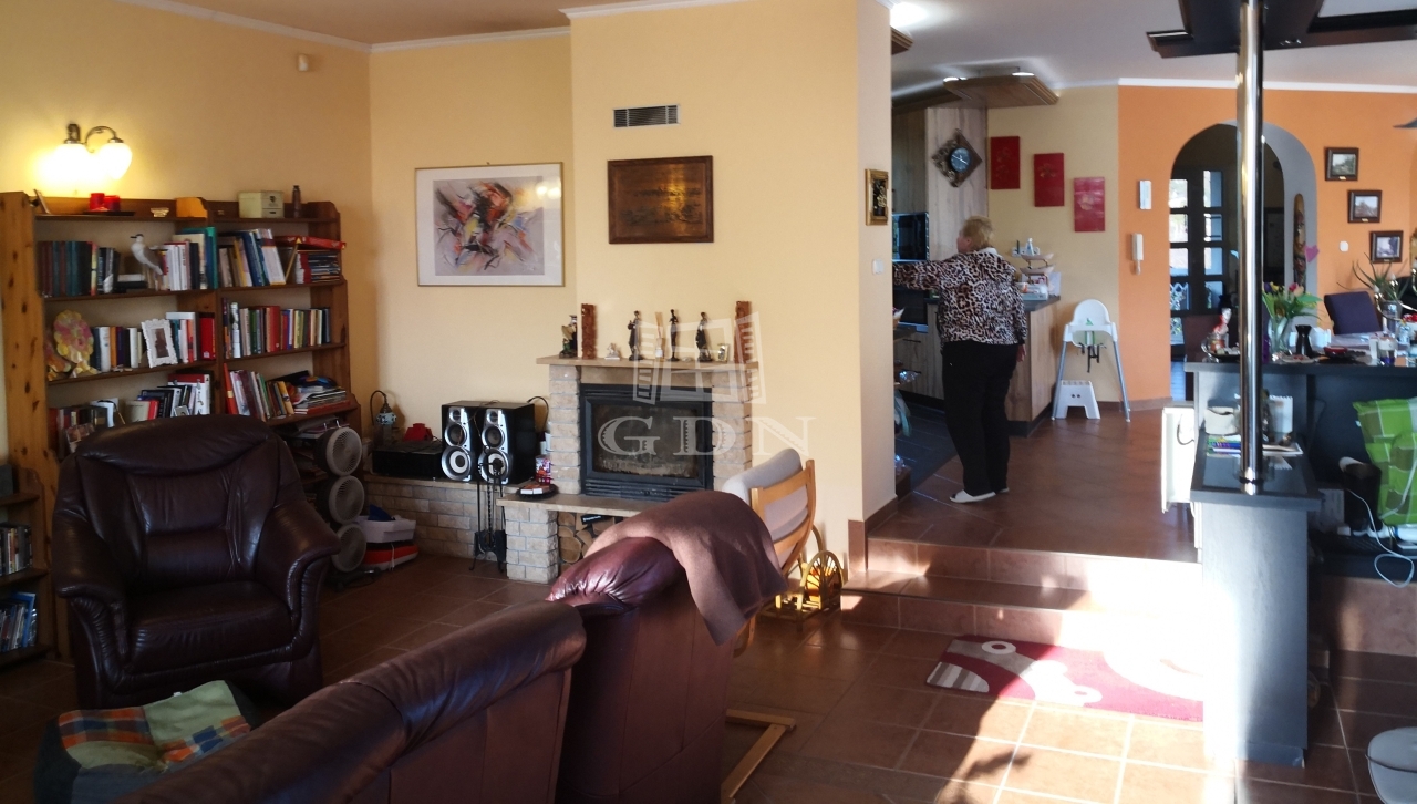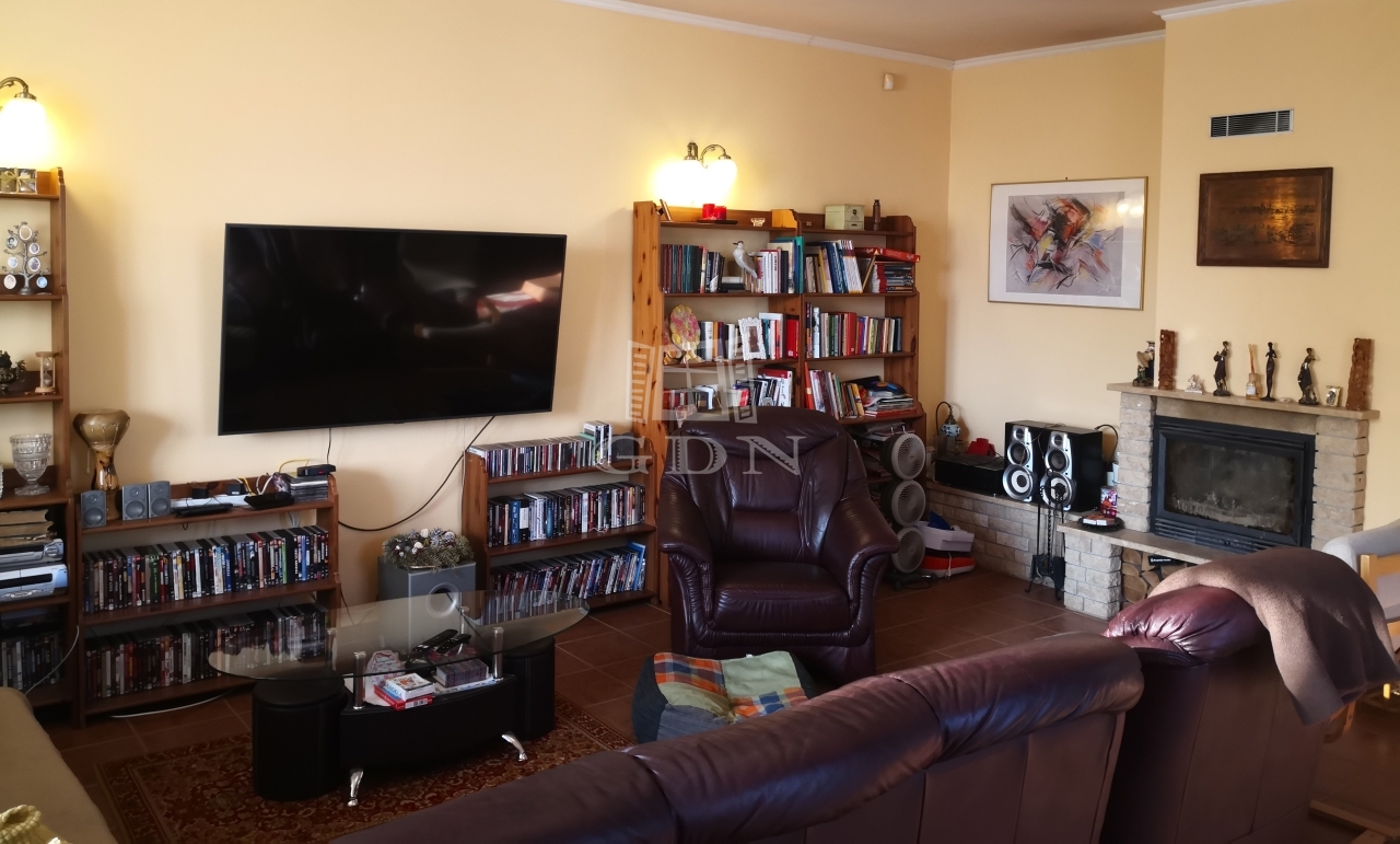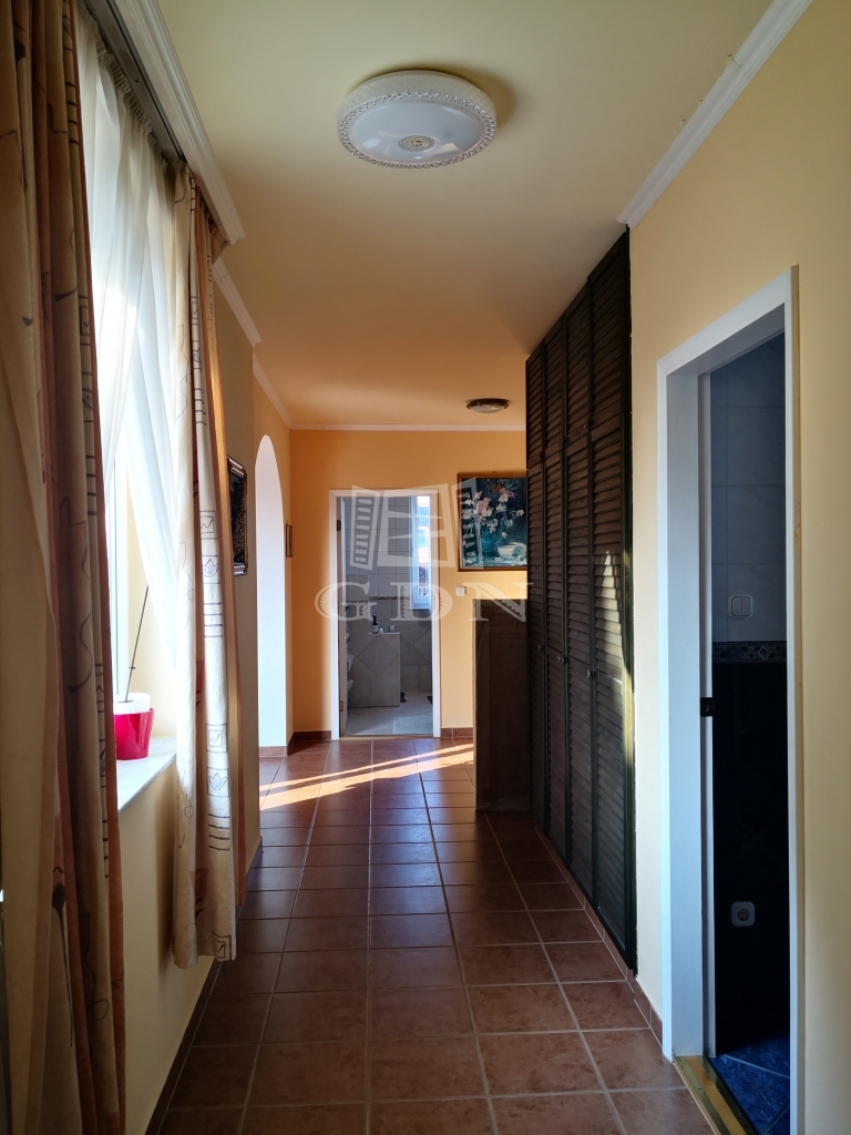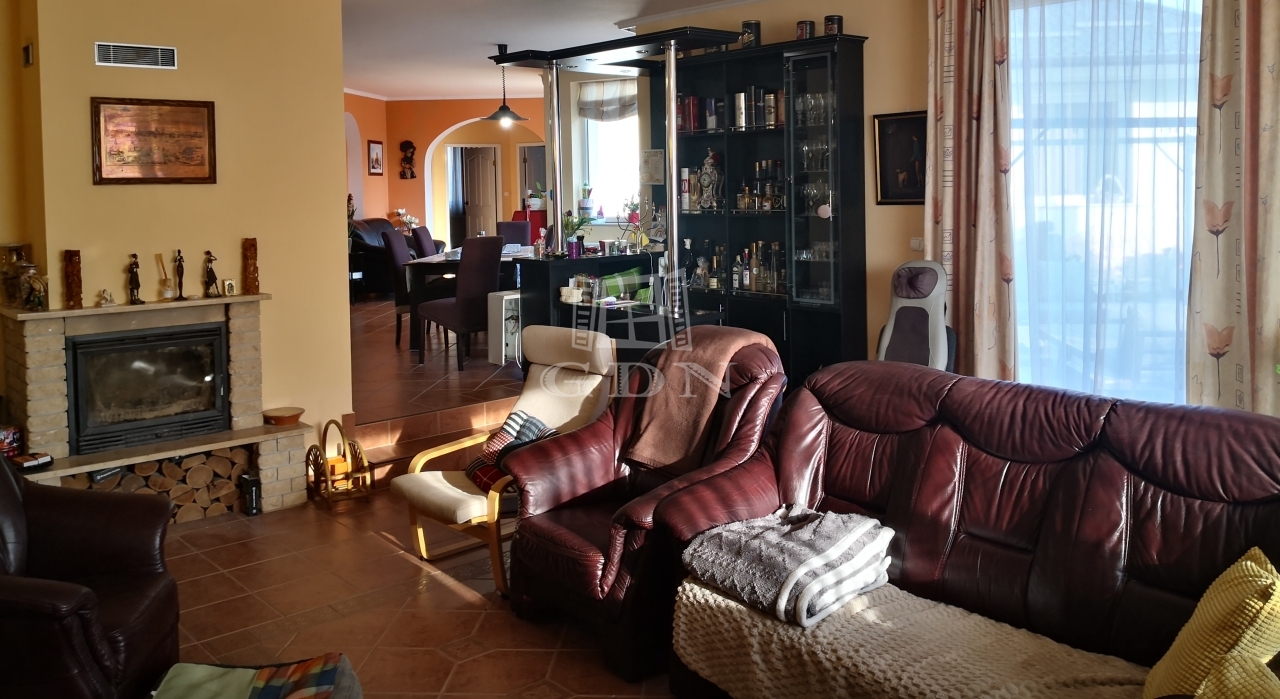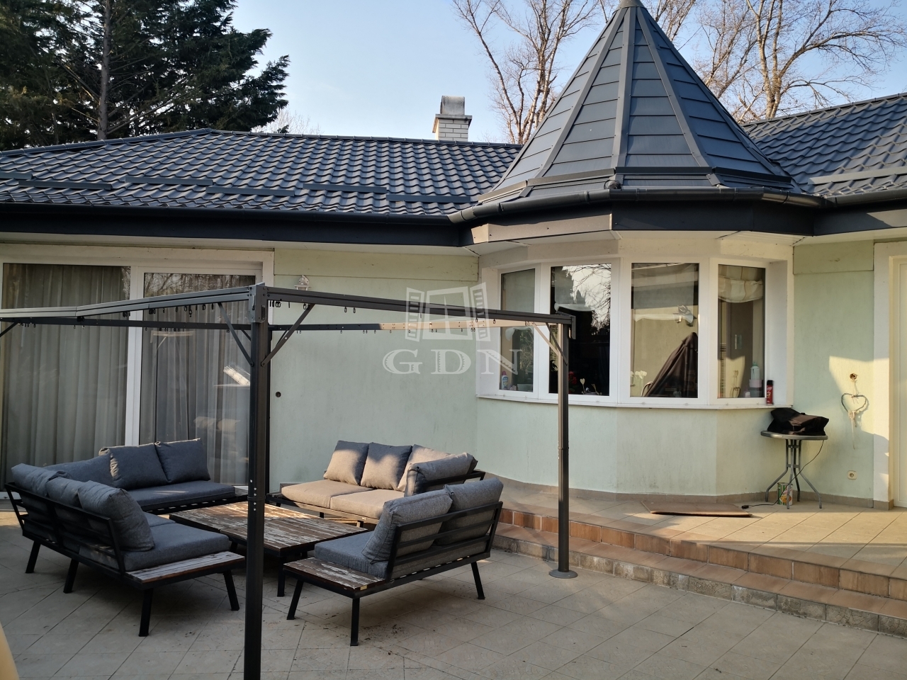 Az épület kert felőli részén nagy méretű, 70 nm-es déli tájolású hangulatos panorámás terasz van kialakítva, melynek egyik oldalán helyezkedik el a nappali, konyha, étkező, a másik oldalán pedig 3 hálószoba, gardrób 2 fürdőszoba és a WC. Az ablakok úgy helyezkednek el, hogy bárhol is vagyunk a házban, mindenhonnan látható a kert és a saját 150 nm-es halas tó.