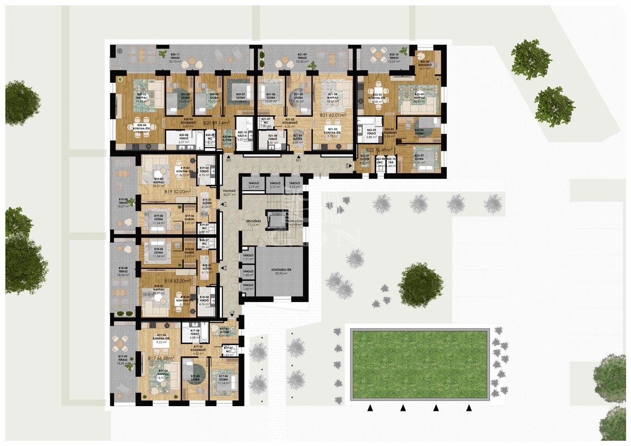 Modern megjelenésű, értékálló, kényelmes és élhető lakóparkban valamint az épületekhez kapcsolódó egyedi lakókörnyezetben szeretne élni? Hamarosan megvalósulhat az álma. A Gyöngyös-patak partján belváros közeli prémium lakások épülnek 20 000 m2-es területen, több ütemben. A tervezés során a funkció, a környezettudatosság és a kényelem voltak a legfontosabb tervezési szempontok. Így különösen az épületek szellős elhelyezése, a lakások kedvező tájolása, az épületek körül a maximális zöldterület és a megfelelő garázs szám biztosítása, a színvonalas közösségi funkciók kialakítása. A lakások értékállóságát és kényelmét az átgondolt tervezés, a minőségi anyagok használata, a nagy méretű, intim teraszok, a lift, a megújuló energia, egyedi és közös tárolók, fedett beállók, garázsok biztosítják. Az alkalmazott szerkezetek megfelelnek a ma érvényes “közel nulla energiaigényű épületek” követelményeinek. Az épületek előtti sétányok díszkivilágítást kapnak mozgás- és alkonykapcsolás vezérlésével. A sétányokról különböző típusú gépkocsi beállóhelyek – felszíni fedett, és normál parkolók ill. garázsok - közelíthetők meg. Egyes parkolók között beruházói döntés szerinti helyen és műszaki kialakítással, elektromos töltőpont csatlakozási lehetőség biztosítható. A közös területek alkalmasak játékra, pihenésre, a földszinti lakások előtti kijelölt zöldterület saját használata mellett. A ház kaputelefon rendszerrel lesz felszerelve. A lépcsőházban és egyéb közös terekben légterenként időkapcsolós világítás lesz kiépítve. A mai korszerű követelményeknek, az épületek hő és hangszigetelése a vonatkozó szabályoknak maximálisan megfelel. A külső hőszigetelés vastagsága 16-20 cm. Az ablakok 3 rétegű üvegezéssel kiváló hőszigetelésű nyílászárók. A lakások padlófűtéssel rendelkeznek, mely a szabadabb belsőépítészeti kialakításoknak ad lehetőséget. A tervek szerint a központi gépészet távfelügyeleti rendszerrel ellátott, távfűtés, így a karbantartás és üzemeltetés során ez gyors beavatkozást és üzembiztonságot eredményez. A fogyasztás egyedi mérőkkel mért, az elszámolást a közös képviselő végzi. A megújuló energia tervek szerint a megfelelő energetikai szabályok alapján kerül telepítésre pl. napelemrendszer. (Kiviteli terv során változhat: kondenzációs gázkazán és/vagy hőszivattyú). Belsőépítész által tervezett lakások, nagy teraszokkal kapcsolódnak a természethez. Befektetőknek, nagy családoknak alkalmas lakások kerülnek kialakításra. A kisebb lakások 52 m2, 62 m2, a nagyobb lakások 67 m2, 76 m2 és 89 m2 nagyságúak lesznek. 12-33 m2 fedett intim teraszok kerülnek kialakításra. Aktuális, bevezető ajánlatban az 1db felszíni parkolót, vízlágyító rendszert, klíma előkészítést ajándékba adja a beruházó. A lakásokhoz tárolók, garázsok vásárolhatók. Kimerítőbb tájékoztatást személyesen. A hírdetésben szereplő lakás 3.emelet 21.