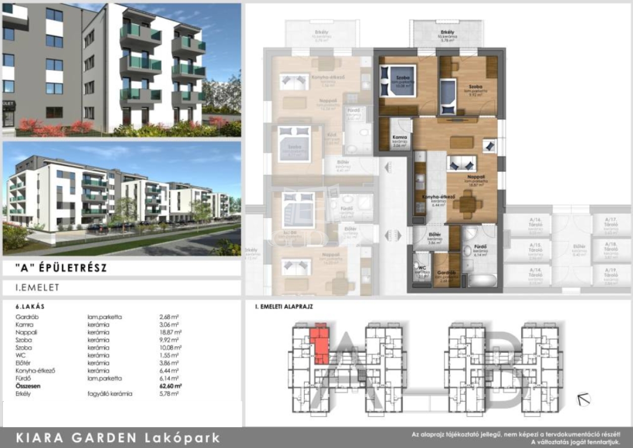 Szombathely zöldövezeti, dinamikusan fejlődő városrészén, energiahatékony, modern lakások várják új tulajdonosaikat. Kiara Garden lakóparkban kettő ütemben épülő , minden igényt kielégítő lakásai nappali+1 szobával, nappali+2 szobával, nappali+ 3 szobával fognak rendelkezni. Az ingatlanokhoz nagy erkélyek teraszok is tartoznak. A legnagyobb lakás dupla komfortos kialakítású lesz. Egyedülállóktól a nagy családosokig megfelelő otthona lehet bárkinek. A belváros közeli ingatlanok lehetőséget biztosítanak egyedi belső kialakításokra. A lakás gazdaságos fűtéséről és melegvíz ellátásáról távhő szolgáltató gondoskodik. A fűtésrendszer egyedileg szabályozható, saját hőmennyiség mérővel ellátott. A hőleadás padlófűtésen keresztül történik. Az ingatlanok ideális hőmérsékletét, a nappaliban elhelyezett split klíma biztosítja. Az épületben kellő számú zárható tároló kerül kialakításra, külön bejárattal. ( 2.96 m2-es tároló 1 790 000 Ft ) Természetesen vannak nagyobb tárolók is. A lakótömbök udvarán található felszíni parkolók ára 1 490 000 Ft. Bővebb tájékoztatásért kérem vegye fel velem a kapcsolatot.