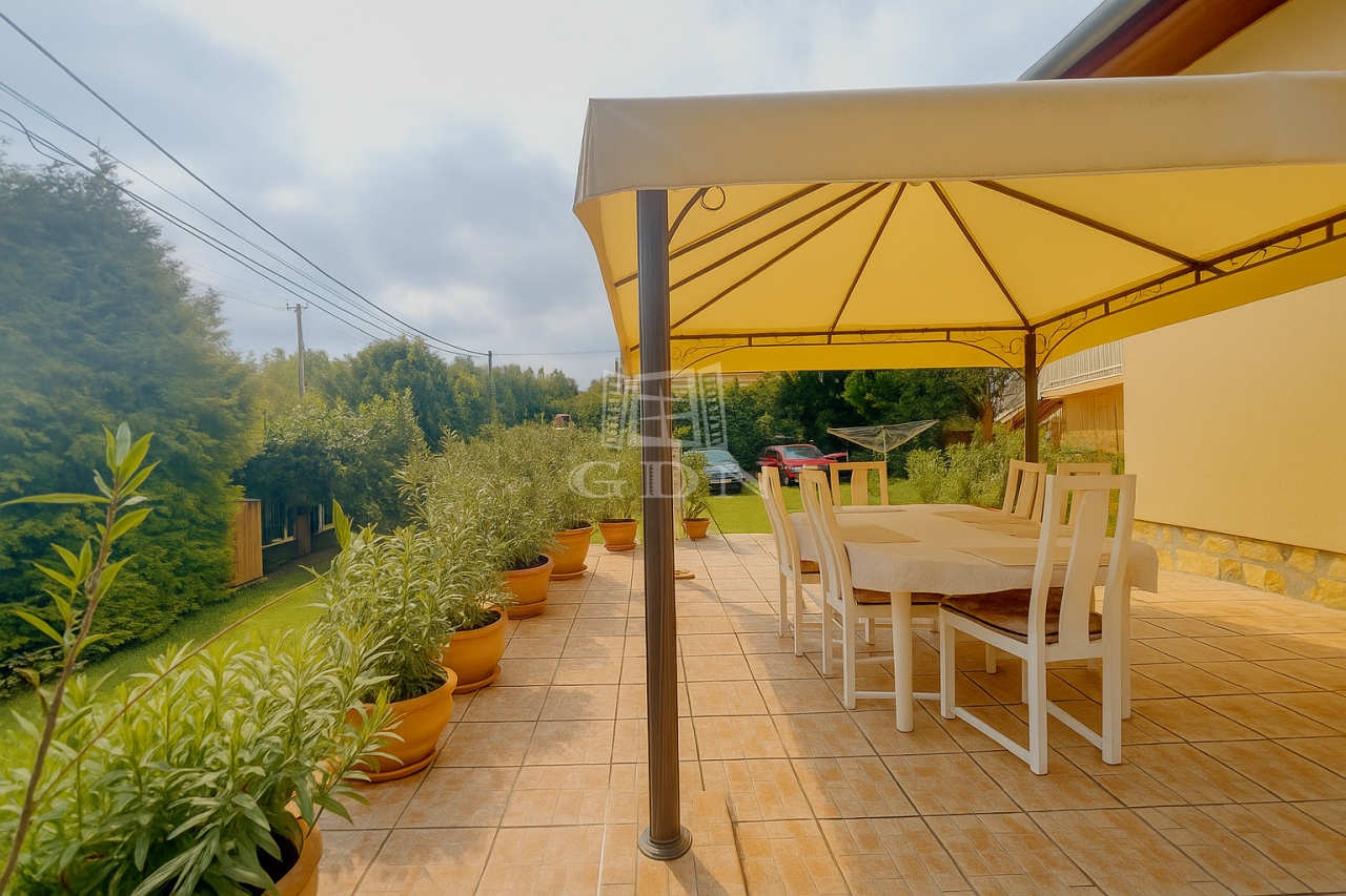 A kert rendezett, barátságos hangulatú, fedett kiülővel és kerti sütőhellyel. Ez az a tér, ahol a nyári esték természetesen telnek, különösebb szervezés nélkül. A házhoz terasz, garázs és több autó számára kialakított udvari parkoló is tartozik.
