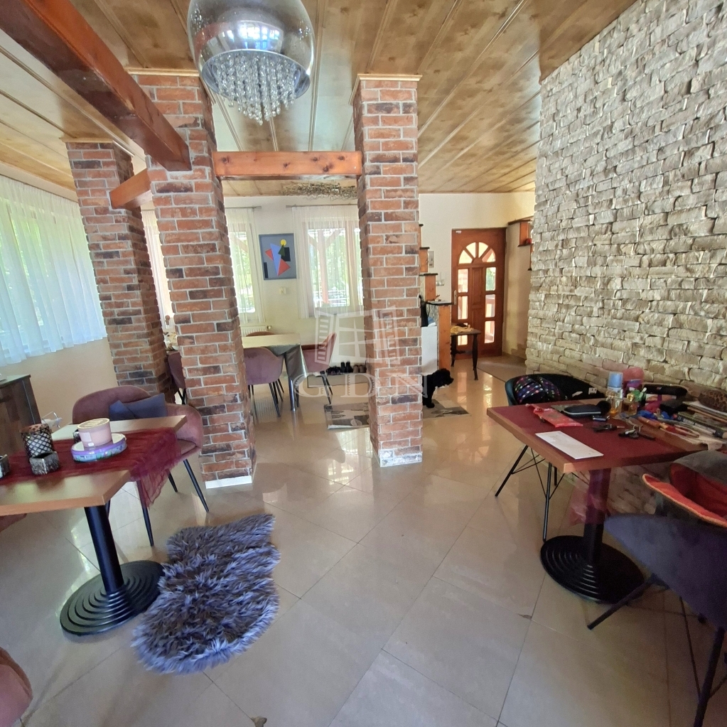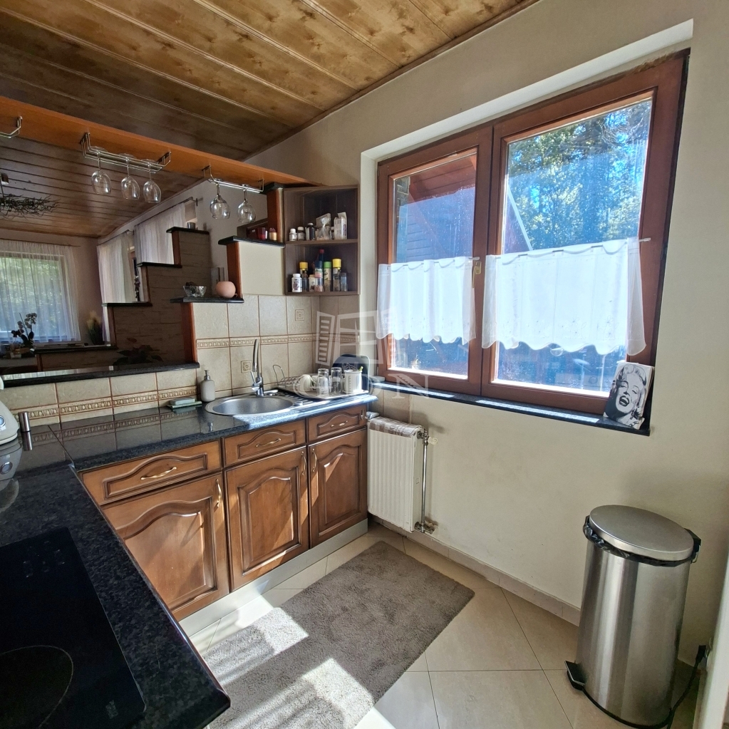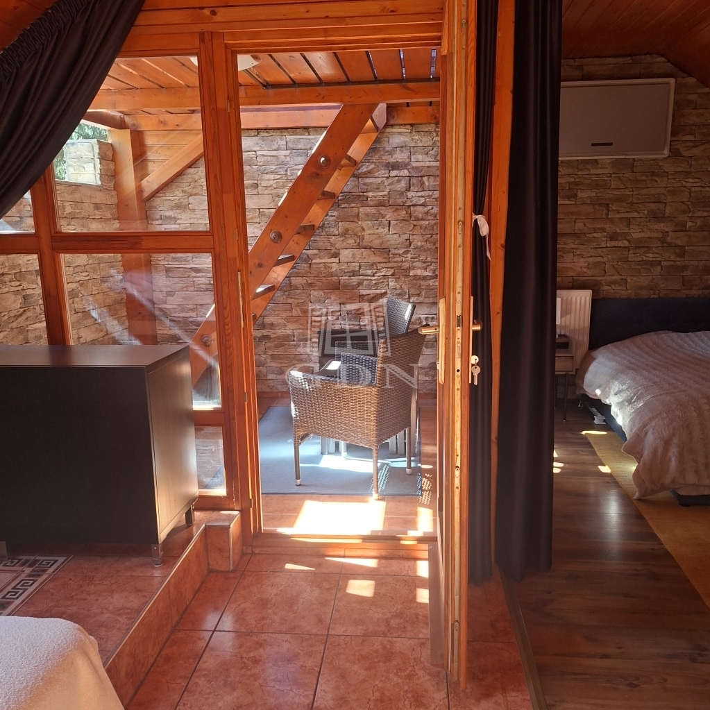 És maga az épület....., a földszinten, ami 84 m2 egy tágas nappali, aminek az udvar felé teljesen üvegezett az oldala, egy nagy étkező, konyha, fürdő és egy tároló található (amit a jelenlegi tulajdonosok vendégszobaként hasznosítanak), a bejárat felől pedig egy fa szerkezetű teraszt alakítottak ki. A tetőtérben, aminek hasznos alapterülete 36 m2, található egy illemhelyiség, fürdő, hálószoba és egy nappali szoba, innen is egy fedett erkélyre jutunk.