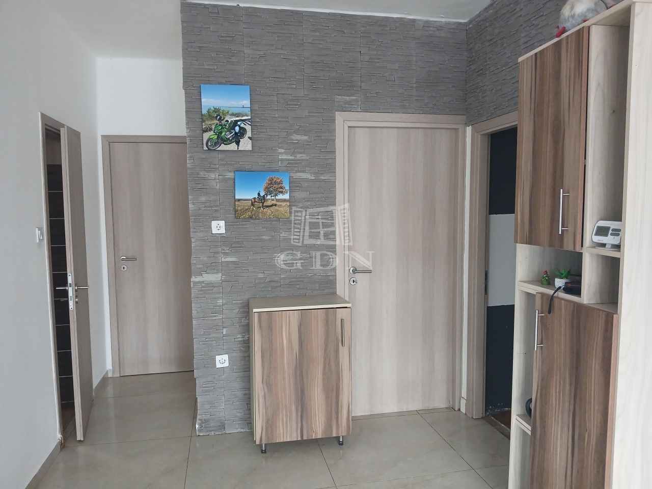 • egy napfényes, modern előszoba, friss dekorkő burkolattal